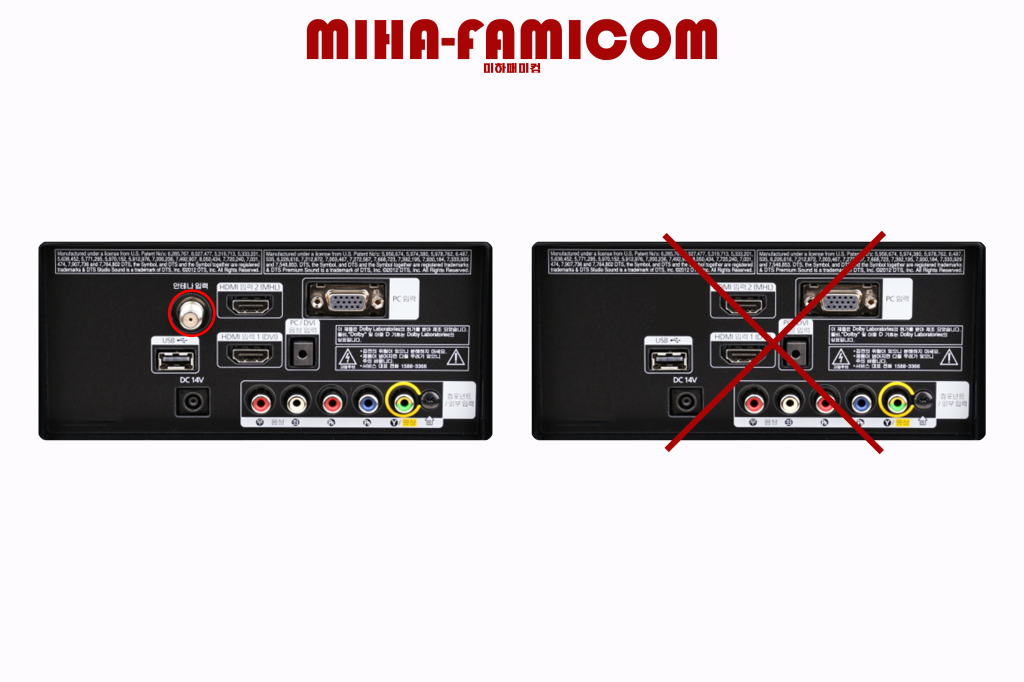 | 1 | 【 RF단자 →TV연결 】 ● 1980~90년대의 감성을 느끼고 싶은 경우 RF단자(사진 좌)를 사용하면 되는데 RF단자는 오리지널 패미컴 RF단자, 호환RF단자(호리) 등 아무것이나 상관없이 준비하면 됩니다. ※ RF단자가 없는 경우, 온라인에서 간단히 'RF케이블 + RCA젠더(사진 우)' 를 구입해 연결할 수 있습니다. ![]() RF단자를 이용하여 연결하려면 연결하려는 TV 및 출력기기에 'TV안테나 입력(사진)' 단자가 존재해야 하므로 만일 컴퓨터 모니터에 TV가 나오지 않는다면 해당 모니터에는 연결 할 수 없습니다. ![]() TV가 나오는 모니터나 일반적인 거실 TV등에 연결해 주시면 되며, 슈퍼패미컴 후면 중앙 RF단자에 사진처럼 케이블을 연결해 줍니다. ![]() 아래 사진과 같이 리모컨 또는 본체 '외부입력 버튼'을 눌러 TV 에 맞춰 줍니다. ![]() 준비가 완료 되었습니다. 슈퍼패미컴 본체에 게임 카트리지(게임팩)를 꼽아 준 후 게임을 즐겨 봅시다. ![]() |