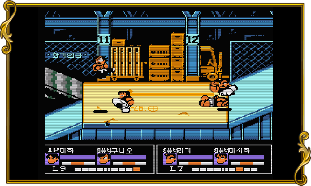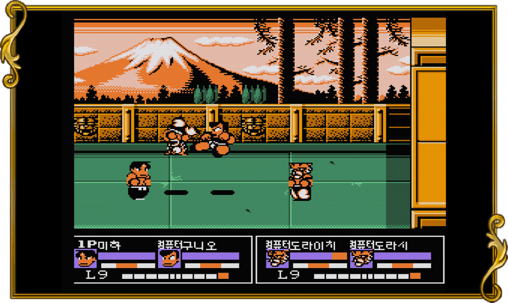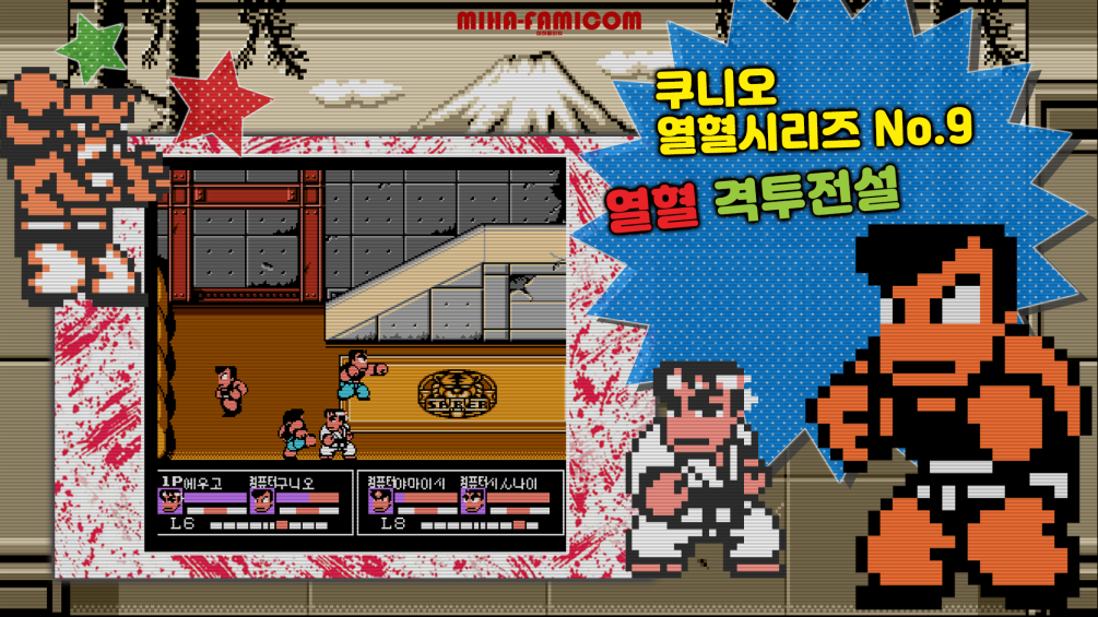 【 게임 정보 】 ● 열혈격투전설(熱血格闘伝説, Nekketsu Kakutou Densetsu) ● Nekketsu Fighting Legend, Crash 'n the Boys Fighting Challenge, 热血格斗传说 ● 패미컴용 쿠니오의 열혈시리즈 9편, 시리즈 최초로 자신만의 오리지널 캐릭터를 만들어 즐기는 대전 격투 게임 ㆍ당시 격투 게임의 높은 인기를 반영하여 패미컴으로 즐길 수 있는 완전한 격투 게임을 만들기 위해 쿠니오와 캐릭터들의 액션을 개발하였다. (개발자 인터뷰 발췌) ㆍ참가 캐릭터 유형 4종 - 전체적인 밸런스의 격투가, 손이 빠른 마샬아츠, 발이 특기인 쿵푸, 던지기에 강한 유도가 ㆍ게임 모드 2종 - 플레이어가 만든 오리지널 캐릭터가 주인공이 되는 '스토리 모드(2대2 태그매치)', 4인이 겨루는 '배틀 모드' ● 패미컴으로 즐기는 완성도 높은 격투 게임, 추천 게임. ※ MIHA-FAMICOM에 사용된 모든 이미지와 영상은 직접 제작 및 리터칭을 거쳐 온라인 최초 공개됩니다 ※ |
